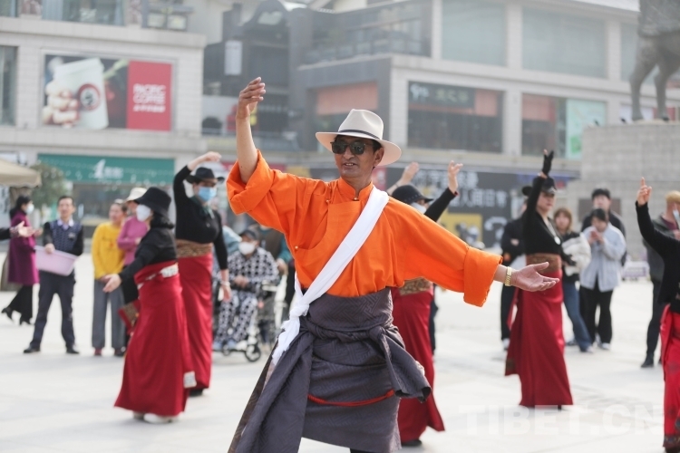 在大唐西市、興慶宮公園等地,沙多等多位藏舞推廣傳承人與西安當?shù)劐伹f舞團隊交流展演,現(xiàn)場氣氛熱烈。