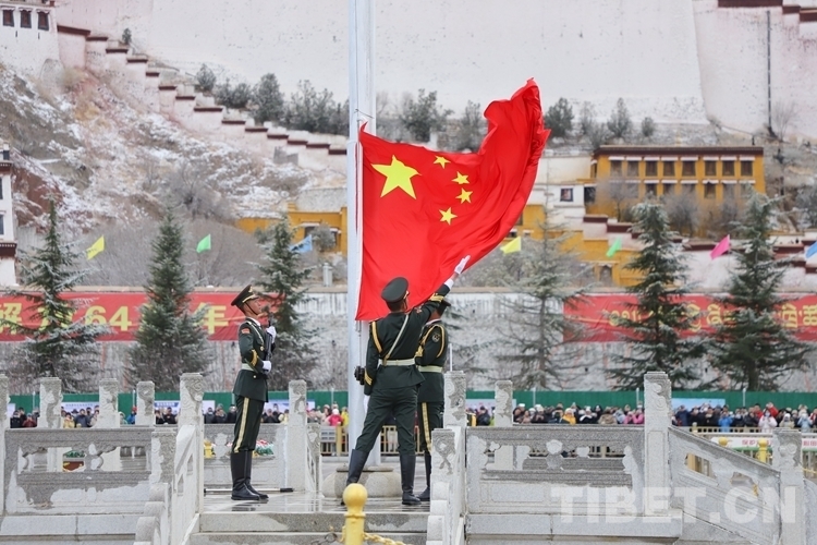 28日清晨,瑞雪洗禮拉薩,處處煥然一新,在干凈清新的氣息中,來(lái)自西藏各族各界的代表2000余人齊聚布達(dá)拉宮廣場(chǎng),以升國(guó)旗、唱國(guó)歌的方式紀(jì)念百萬(wàn)農(nóng)奴解放64周年。