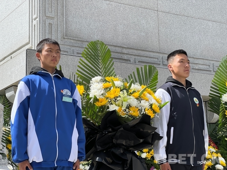 圖為拉薩那曲第一高級(jí)中學(xué)學(xué)生代表向革命先烈敬獻(xiàn)花籃 攝影:德吉卓瑪