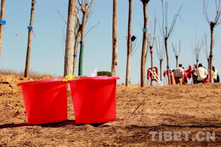 圖為來自青海省果洛藏族自治州的多杰奮力揮動(dòng)鐵锨與大家一起植樹 攝影:劉莉