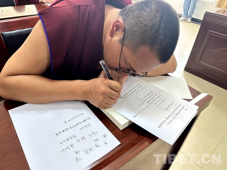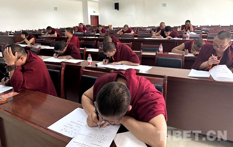 圖為中國(guó)藏語(yǔ)系高級(jí)佛學(xué)院2023年“拓然巴”高級(jí)學(xué)銜班招生考試(西藏)考點(diǎn)的筆試現(xiàn)場(chǎng)