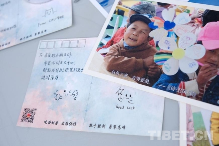 參與活動(dòng)的同學(xué)們?cè)诜逶粕缛宋目瓶缄?duì)準(zhǔn)備的明信片上寫下對(duì)當(dāng)?shù)匦∨笥衙篮玫淖8?。一張張寫著滿滿關(guān)切話語(yǔ)、畫著生動(dòng)可愛(ài)圖案的明信片上,飽含著中國(guó)農(nóng)業(yè)大學(xué)師生對(duì)雪域高原孩子們滿滿的愛(ài)意。