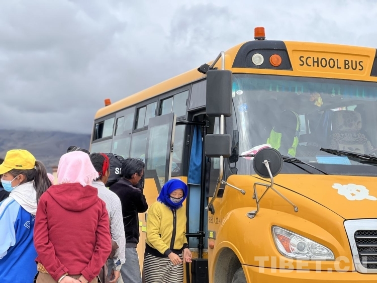 上午十一點,穿著牧區(qū)藏袍、頭戴淺色頭巾的婦女和紅色“扎秀”(辮尾)的男士背起牛羊毛編織的背包,牽著自家小孩的手紛紛到達(dá)集合點?!靶\噥砝?!”學(xué)生們在村委會院子里自覺排起了隊。