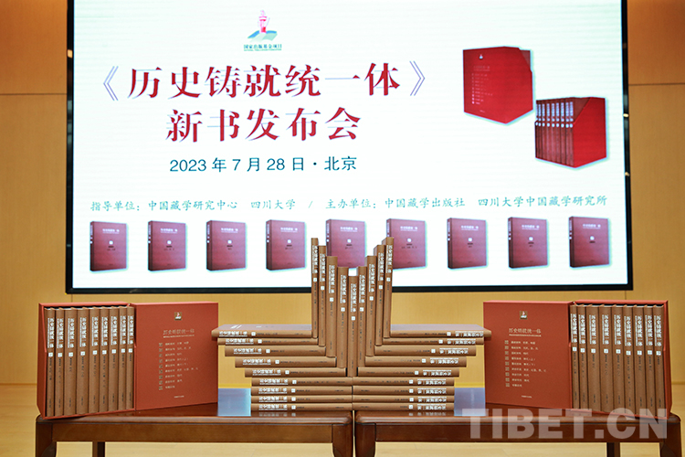 圖為發(fā)布會現(xiàn)場展覽的《歷史鑄就統(tǒng)一體:考古與文物所見西藏和中原關(guān)系資料研究》全套圖書 攝影:陳衛(wèi)國