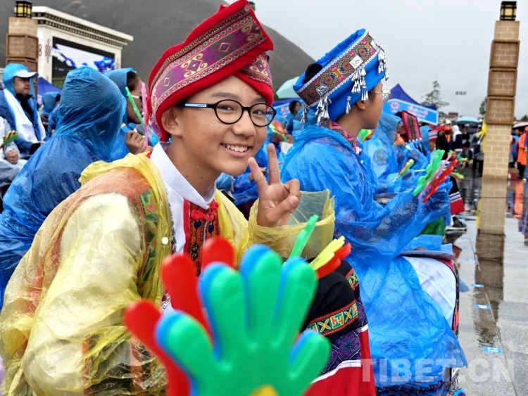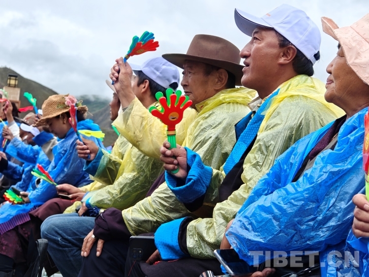 當(dāng)天上午,雨水時(shí)急時(shí)緩下著。當(dāng)?shù)孛癖姄沃鴤?、披著雨衣早早落座等待演出開始。白瑪次仁是附近的村民,他告訴記者:“我平時(shí)就喜歡唱歌和跳舞,所以收到有文藝演出的通知就早早過(guò)來(lái)觀看,畢竟平時(shí)很少看到如此大型的演出?!?/span>