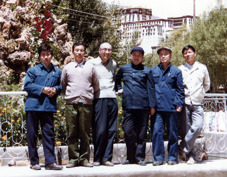 原國(guó)務(wù)院西藏經(jīng)濟(jì)工作咨詢組駐藏組范小建(右一)與本組人員趙清政、石萬鵬、齊曉魯、府培生、冉令申(從左至右)在拉薩布達(dá)拉宮前合影留念(范小建提供,1984年6月攝)