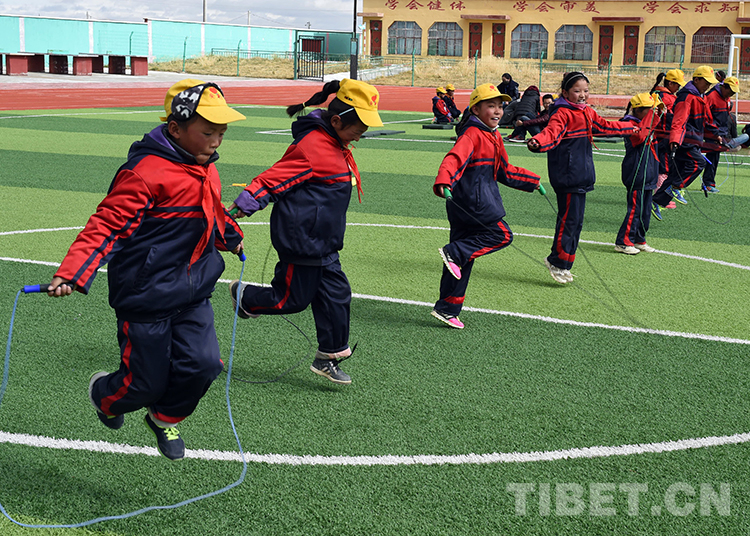 西藏那曲地區(qū)那曲縣(現(xiàn)那曲市色尼區(qū))羅瑪鎮(zhèn)中心小學(xué)的學(xué)生們?cè)谶M(jìn)行跳繩比賽(唐召明2016年10月5日攝)