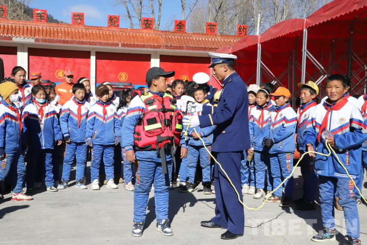 圖為昌都市森林消防支隊(duì)左貢縣中隊(duì)聯(lián)合該縣第二小學(xué),開展“消防安全進(jìn)校園”活動(dòng),使學(xué)生們?cè)谠⒔逃跇分姓莆杖粘O腊踩R(shí)