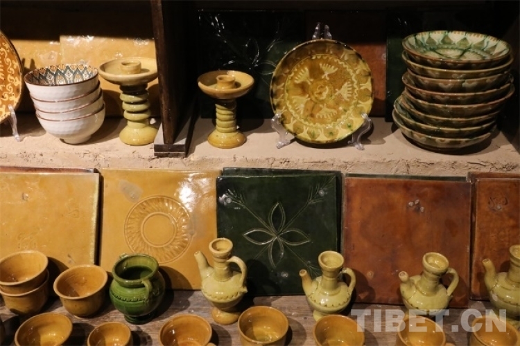 這里的土陶都緊湊而有序地被擺放在架子上,或者集中放在房間的空地上圍成一圈。一眼看去,架子上的土陶手工藝品都透露出泥土本身的顏色質(zhì)感,部分碗碟、杯具等制品通過(guò)各類顏色的浸染,呈現(xiàn)出青翠欲滴或金黃澤亮的顏色樣態(tài),在無(wú)聲中展現(xiàn)著古樸技藝的獨(dú)特魅力。