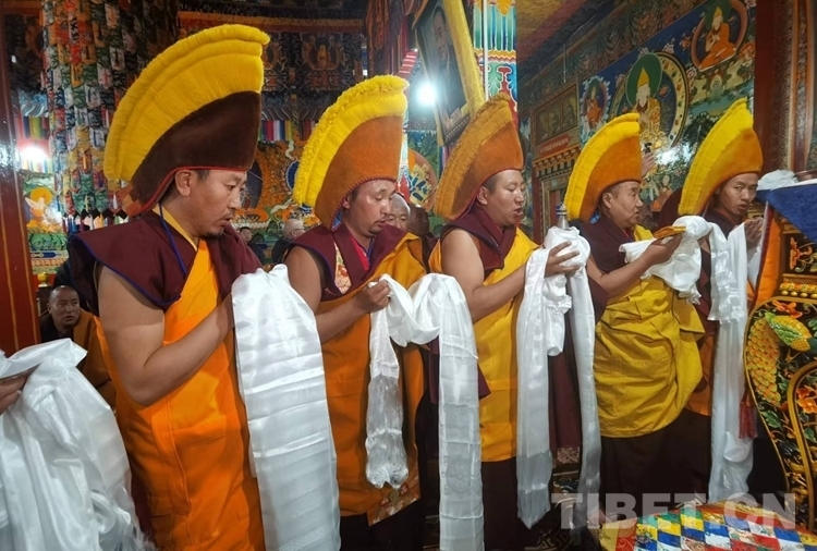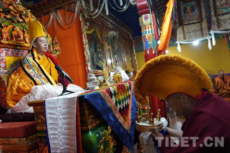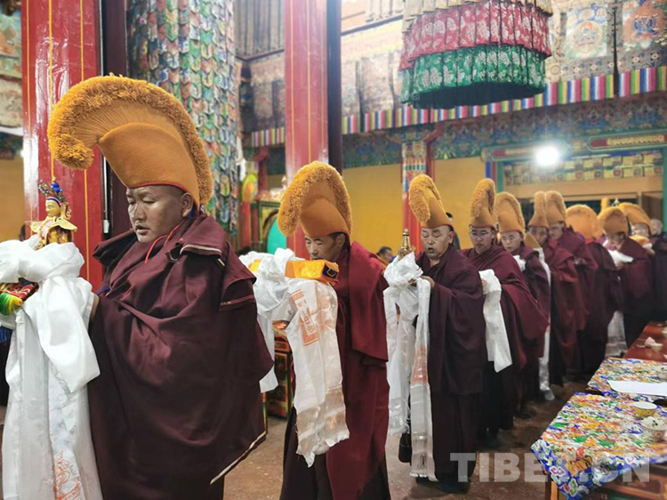 當日的拉定寺裝飾一新,班禪一行抵達后,現(xiàn)場法號齊鳴、法螺合奏,倫珠晉巴和僧眾在寺廟前舉行了隆重的歡迎儀式。隨后,在手持香爐、寶傘高僧的引導護送下,班禪步入主殿上寶座,向寺廟僧眾傳授《三主要道論》,為僧眾摸頂賜福、發(fā)放布施。