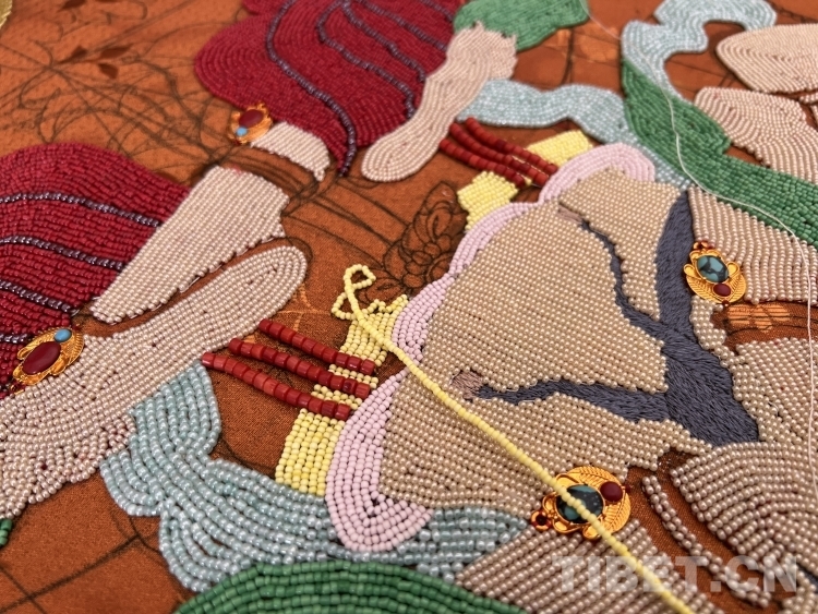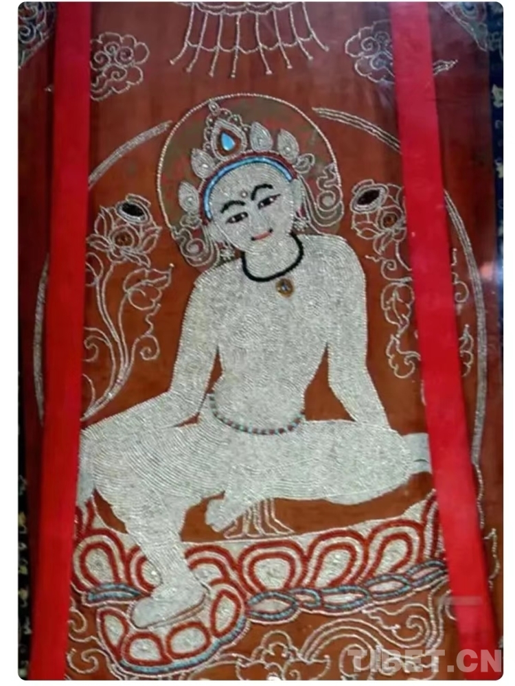 掌握了藏繡技藝,夫妻二人有了新的發(fā)展目標。在傳承和發(fā)展傳統(tǒng)堆繡技藝的同時,土旦想要創(chuàng)新更有特色的藏繡作品,于是創(chuàng)作“珍珠唐卡”的想法在他腦海中萌生?!爸韵胍獎?chuàng)作珍珠唐卡,是因為有次我在山南的昌珠寺看到了‘觀世音菩薩憩息圖’這幅珍珠唐卡,我被它精美絕倫的制作工藝深深吸引,心想自己從事堆繡創(chuàng)作多年,也應該去嘗試制作‘珠繡’作品了。”土旦向記者講述了他與珍珠唐卡的“結(jié)緣”經(jīng)歷。