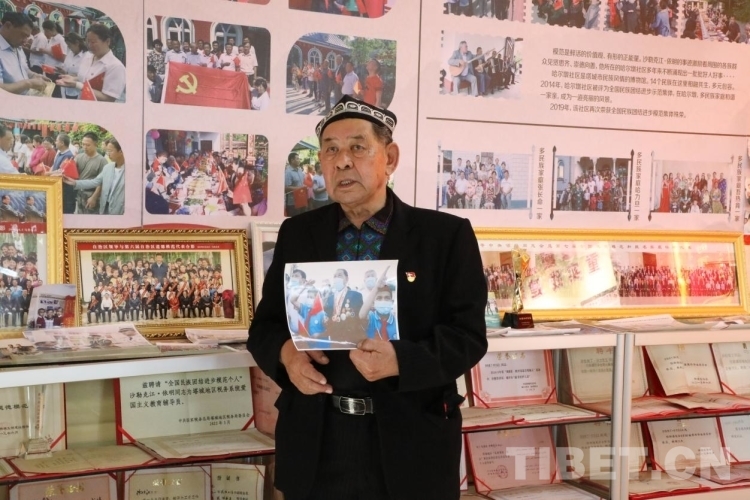 在講述故事的時(shí)候,沙勒克江·依明老人總是把腰背挺得直直的,雙眼的目光有神而堅(jiān)定,說話吐詞帶有重音和落地實(shí)感。當(dāng)他拿起照片,講起自己觀看天安門廣場(chǎng)的升旗儀式時(shí),他會(huì)用腳一聲一聲地踏出聲音,沉浸描述當(dāng)時(shí)國旗班的腳步聲帶給他的心靈震撼。而隨著他的動(dòng)作,我們的身心也顫抖了起來。
