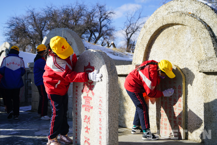 圖為多白鄉(xiāng)小學生在拉薩市烈士陵園內擦拭烈士墓碑 攝影:趙振宇