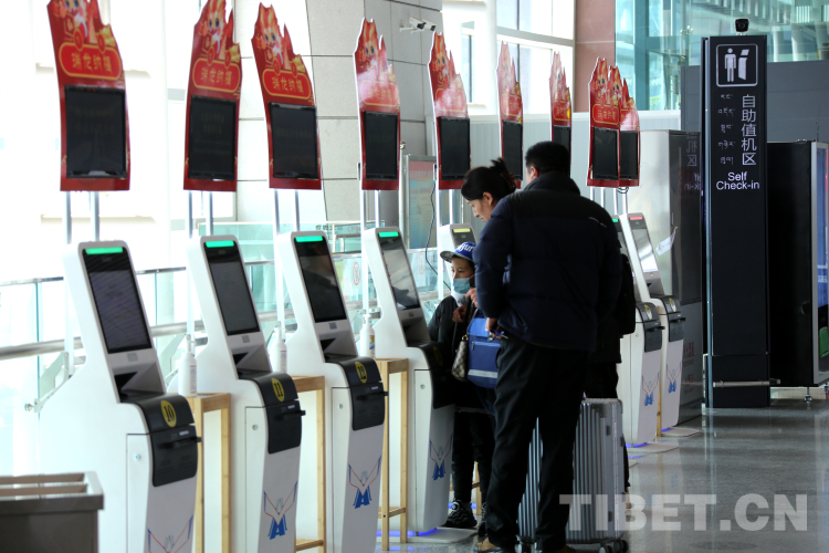 圖為春運首日,拉薩貢嘎機場內(nèi)乘客在自助辦理值機 攝影:王佳豪