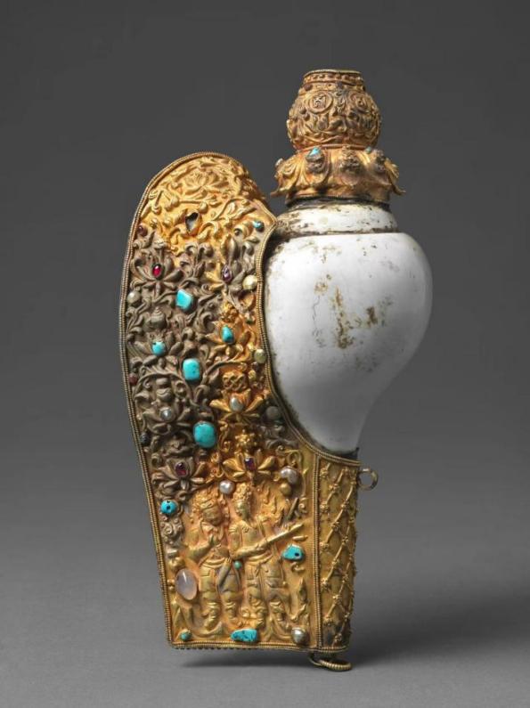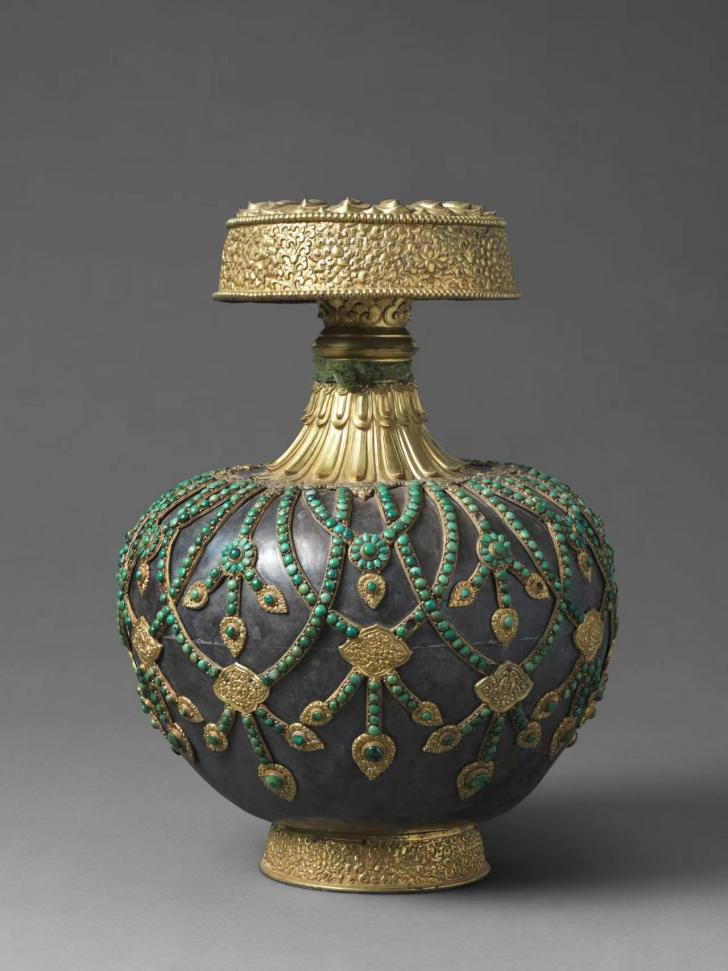 圖為公元18世紀(jì)銀質(zhì)嵌松石瓔珞紋尊勝瓶