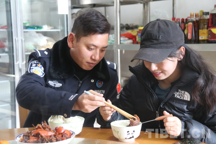 氧氣瓶、高原藥品、熱水......接德吉永措的車(chē)上已準(zhǔn)備好了各種抗高反和取暖的東西,這讓她提前感受到了來(lái)自丈夫單位的熱情與關(guān)懷。與愛(ài)人相聚后,旦增洛追帶著妻子參觀營(yíng)區(qū),迫切地想讓她了解他用青春為之奮斗的警營(yíng),隨后他又帶著妻子到單位食堂品嘗自己親自下廚做的紅燒肉。“嗯!味道很好。”德吉永措吃著丈夫給她夾的肉,臉上洋溢著幸福的笑容。