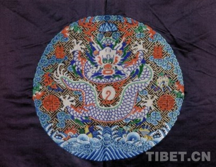 褂圓領(lǐng),對(duì)襟,平袖,裾后開。褂用二至四色暈法,在石青色緞地上以平針、套針、平金等針?lè)熬兠字楣に嚥世C、穿綴萬(wàn)字地八團(tuán)彩云白龍紋、海水江崖及雜寶等紋樣。袍內(nèi)襯月白色祥云團(tuán)龍壽字織金緞里。袖口沿鑲石青萬(wàn)字織金緞邊。領(lǐng)口綴銅鎏金鏨花扣一,余綴石青色織金緞扣袢四。