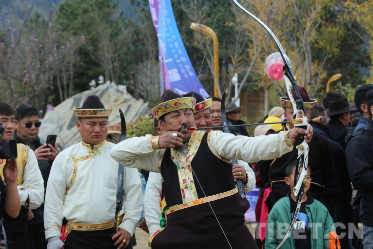 一陣“比嗚”聲從工布天街公園傳出,大家鼓掌喝彩。這里是民俗競技體驗區(qū)最熱鬧的工布響箭比賽現場,工布響箭藏語稱“畢秀”,是西藏自治區(qū)林芝市特有的一項民間傳統體育競賽項目,距今已有1500多年歷史,被列入西藏第二批自治區(qū)級非物質文化遺產名錄,是林芝慶祝豐收、迎接新年等重要節(jié)慶活動時必不可少的體育娛樂活動。
