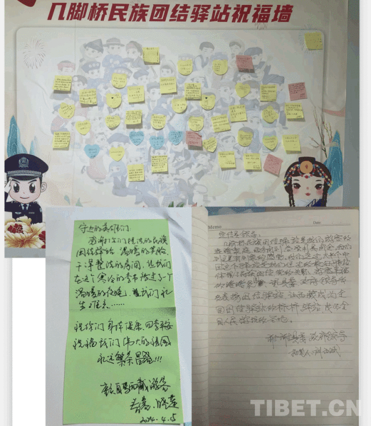 記者在社交媒體上也看到了很多游客以視頻、圖文等形式分享了他們和幾腳橋民族團結(jié)驛站的故事?!耙驗楫?shù)靥厥庠蛭覀兊娇h城沒有地住了,在小紅書上看到這個驛站可以留宿,實在沒有辦法去邊防檢查站詢問。邊防小哥哥了解原因后特別暖心立馬給我們安排住宿,洗漱用品樣樣不差,太贊啦!這是我這一路旅行睡得最香的一晚,主要還免費!”一位游客半調(diào)侃地分享了自己的故事,還加了三張夜拍驛站的圖片。一張用外景,在夜里,“幾腳橋民族團結(jié)驛站”漢藏雙語大牌十分醒目;一張室內(nèi)環(huán)境,左右兩邊的上下鋪床上放著四個“豆腐塊”被子,床單潔白如新,中間的小桌子上還放著氧氣罐、雜志、臺燈等用品;一張貼滿祝福與感謝的“便簽墻”……張張圖片體現(xiàn)了驛站工作人員的用心良苦,也定格著他難忘的定結(jié)記憶。