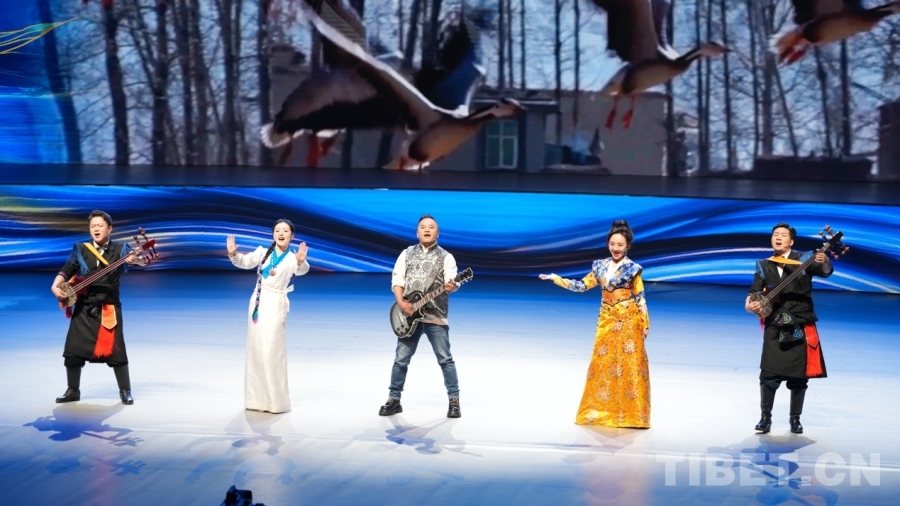 專題演出由開場《祖國萬歲》、上篇《尋夢天湖》、下篇《歡歌拉薩》、尾聲《扎西德勒》四個部分構成。通過充分挖掘拉薩的民俗風情,將藏族歌舞、傳統(tǒng)說唱藝術等元素巧妙地融入其中,用視頻展示的自然風光、人文景觀作為輔助,優(yōu)化舞臺布局設計,巧妙布景,為觀眾營造一種身臨其境的感受,共同創(chuàng)造出一個充滿歡樂與感動的氛圍,力圖讓更多的人了解拉薩、愛上拉薩,感受這座城市的獨特魅力和文化內(nèi)涵。此外,還邀請了容中爾甲、四郎貢布、次仁桑珠、益西卓瑪?shù)妊菟嚱缛耸抗嬷囇莩?,進一步豐富和活躍專題演出氛圍。