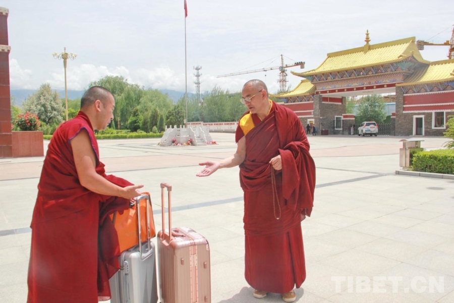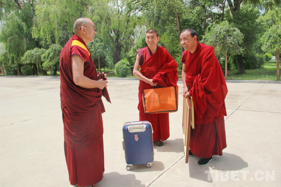 圖為青海省藏語系佛學(xué)院教務(wù)處副處長、特級經(jīng)師悟嘉倉(右一)與準(zhǔn)備離校的畢業(yè)學(xué)僧交談 攝影:劉莉