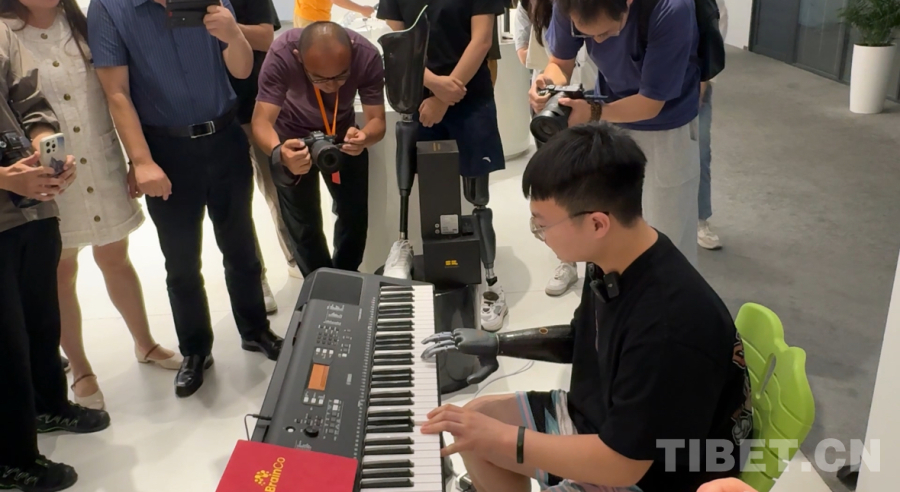 圖為BrainCo強腦科技產品體驗官周鍵在彈鋼琴
