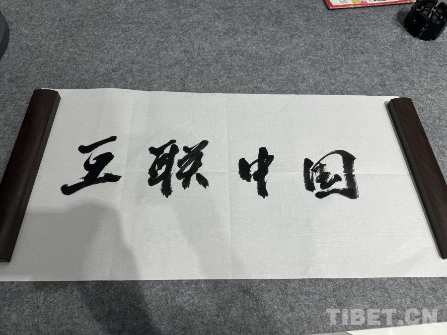 圖為BrainCo強腦科技產品體驗官倪敏成用毛筆字寫的“互聯中國”四字