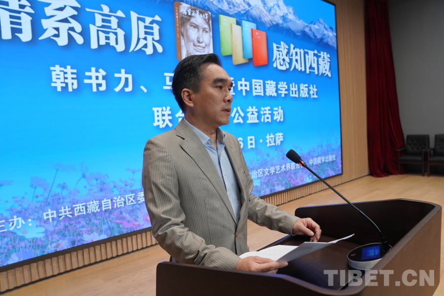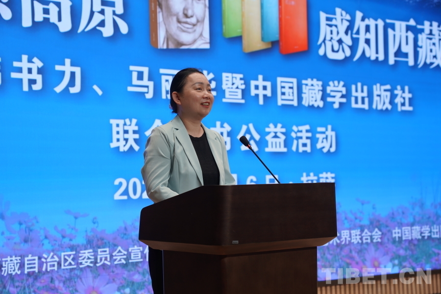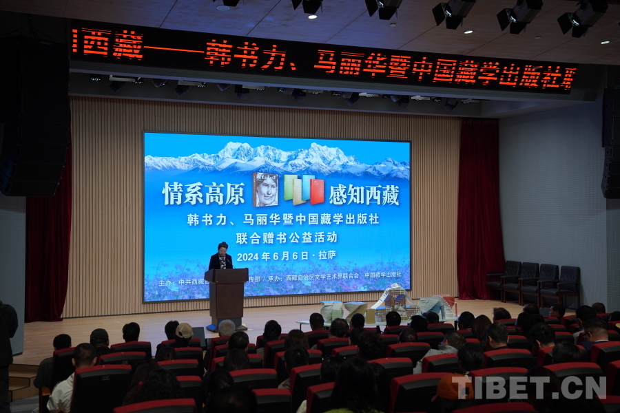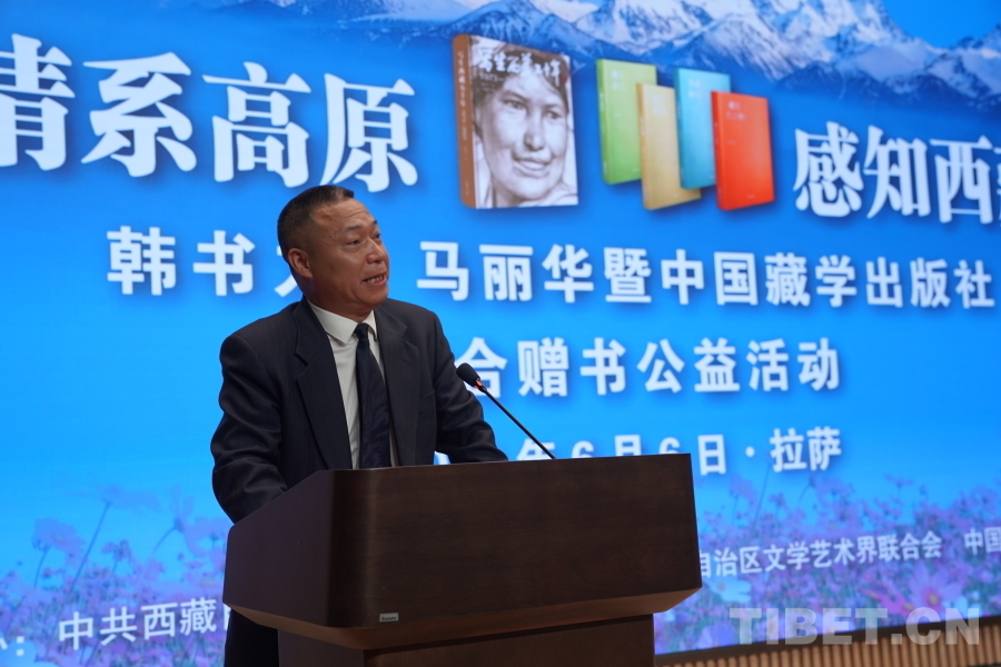 中國西藏網(wǎng)訊 6月6日上午,由西藏自治區(qū)黨委宣傳部主辦,自治區(qū)文聯(lián)、中國藏學(xué)出版社承辦的“情系高原 感知西藏——韓書力、馬麗華暨中國藏學(xué)出版社聯(lián)合贈(zèng)書公益活動(dòng)”在西藏美術(shù)館學(xué)術(shù)報(bào)告廳舉辦。自治區(qū)黨委宣傳部副部長何瑞,中國藏學(xué)出版社社長洪濤,自治區(qū)文聯(lián)黨組成員、副主席陳人杰,自治區(qū)黨委原常委、自治區(qū)政協(xié)原副主席德吉措姆,自治區(qū)文聯(lián)原主席、西藏美術(shù)家協(xié)會原主席韓書力,中國藏學(xué)出版社原總編輯、自治區(qū)文聯(lián)原副主席、西藏作家協(xié)會原副主席馬麗華等參加活動(dòng)。