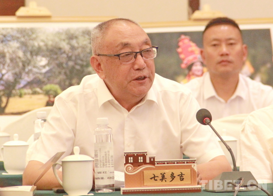 圖為道孚籍學(xué)者七美多吉在“花開道孚 潤道有聲”道孚縣文化傳承發(fā)展座談會上介紹道孚傳統(tǒng)文化有關(guān)情況 攝影:劉莉
