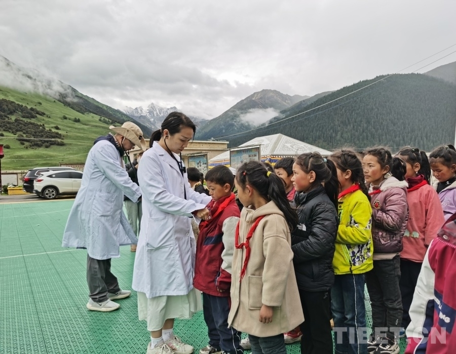圖為醫(yī)療專家團(tuán)隊(duì)在巴塘縣波密鄉(xiāng)格木村中心小學(xué)開展先心病篩查聽診工作 攝影:白瑪司郎