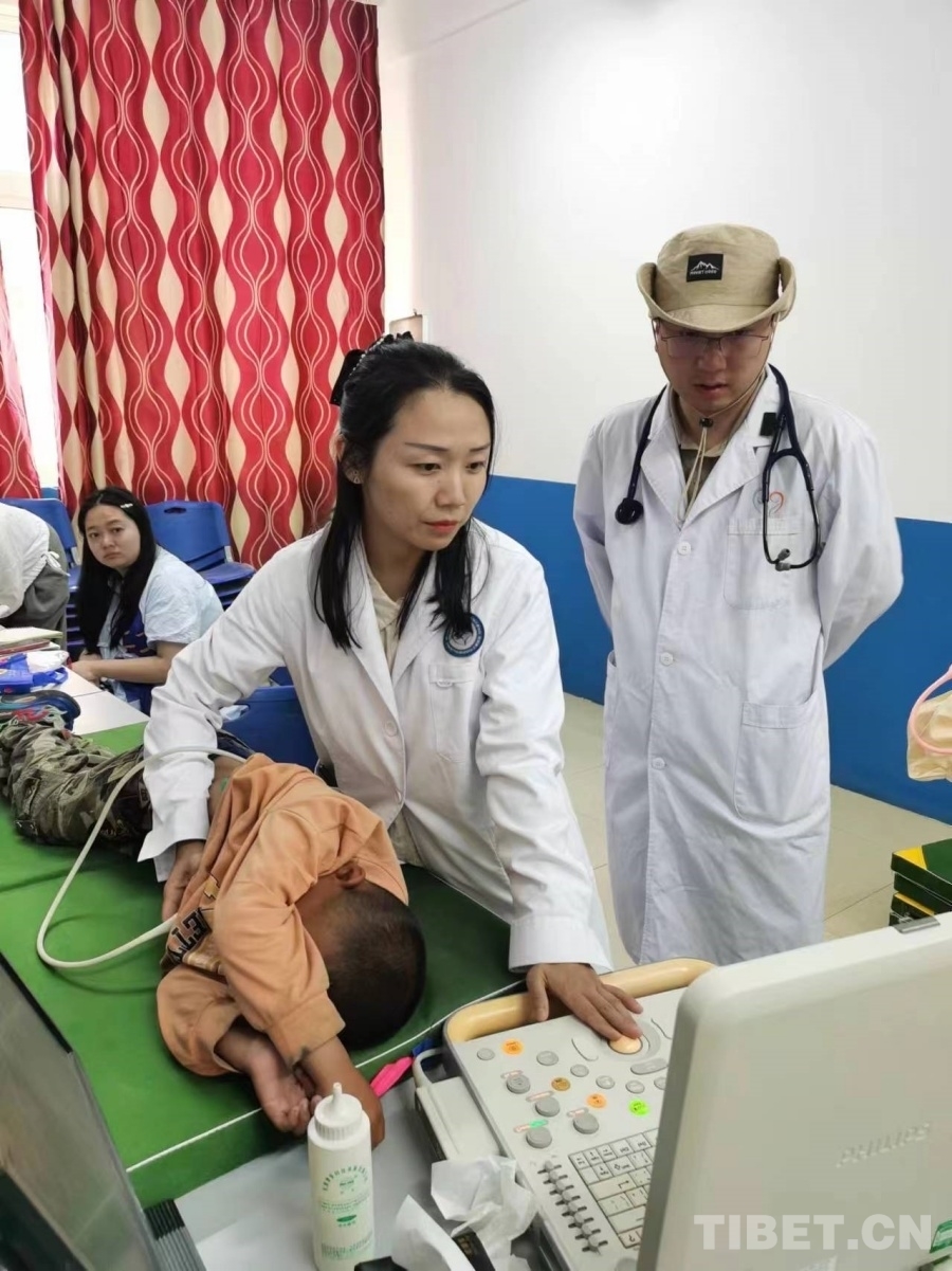 圖為醫(yī)療專家團(tuán)隊(duì)在給疑似先心病患兒做心臟超聲檢查 攝影:白瑪司郎
