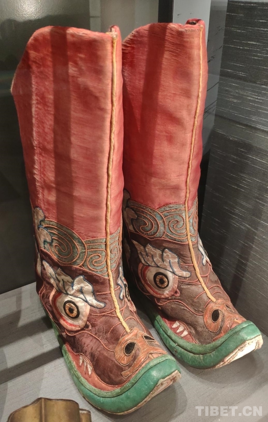 15號藏品為龍首紋藏靴,出自西藏,進入館藏時間為1905年。據(jù)博物館介紹,這雙靴子不是一般藏族百姓穿的靴子,而是降神者在降神儀式上所穿用的。這雙靴子除了具有一般藏靴的特征外,鞋面繡有龍首,代表神圣之意。靴型寬大,前頭略尖,且向上翹起,造型別有韻致。