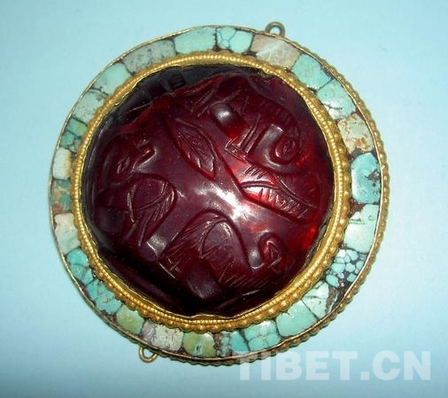 大英博物館藏19世紀圓形銅鎏金鑲紅玻璃綠松石飾品(16號)
