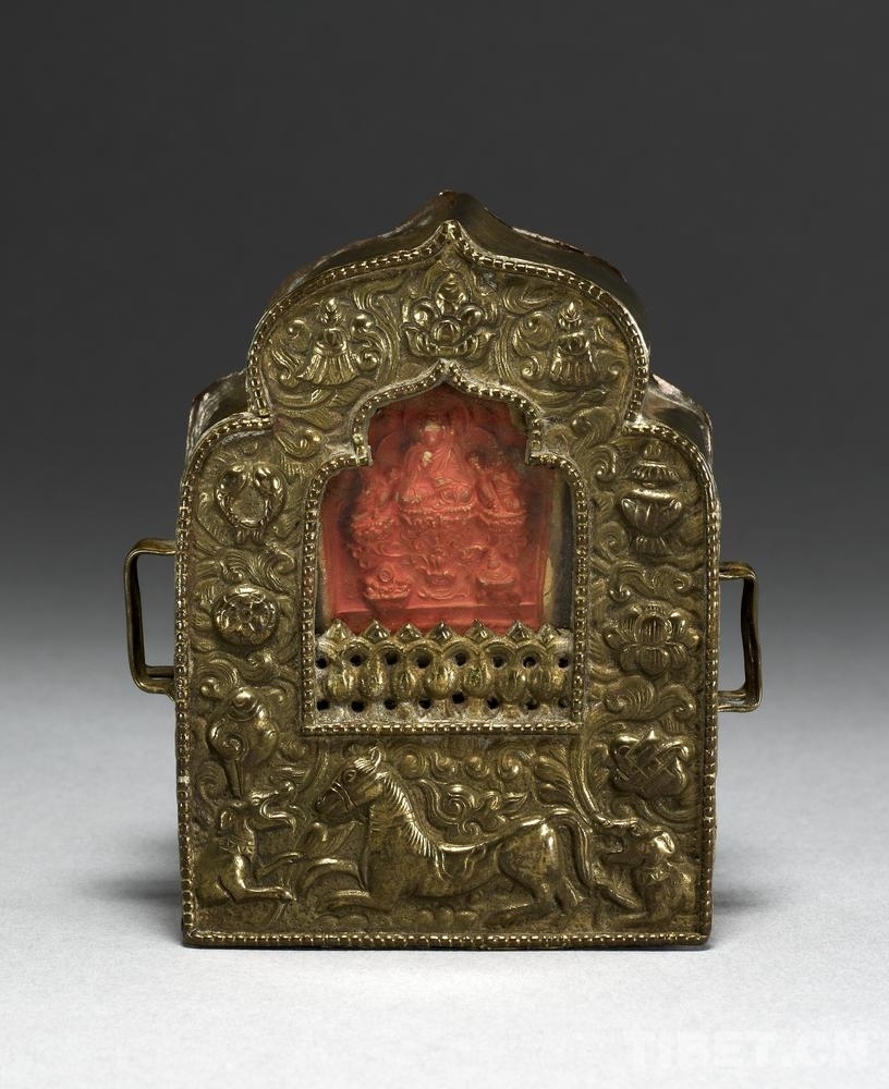 19號藏品為銅制“嘎烏”,內(nèi)裝有“擦擦”和香料包,出自西藏,進入館藏時間為1905年?!案聻酢?,是藏語的音譯,指護身佛的盒子,即小型佛龕。盒子里一般裝有“擦擦”佛像、印著經(jīng)文的綢片、舍利子或者甘露丸、由高僧念過經(jīng)的藥丸,以及活佛的頭發(fā)、衣服的碎片等。“嘎烏”還是精美的裝飾品。其形狀不一,一般為銀質(zhì)或銅質(zhì),盒面上鑲嵌有瑪瑙、綠松石,雕刻有多種花紋圖案。