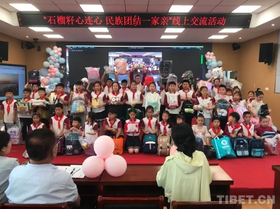 圖為安徽明光市明湖學校與西藏浪卡子縣打隆鎮(zhèn)小學開展“石榴籽心連心民族團結(jié)一家親”線上交流活動
