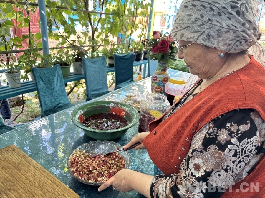 圖為63歲的哈妮克孜正在制作樹莓核桃的包子餡兒 攝影:楊眉笑