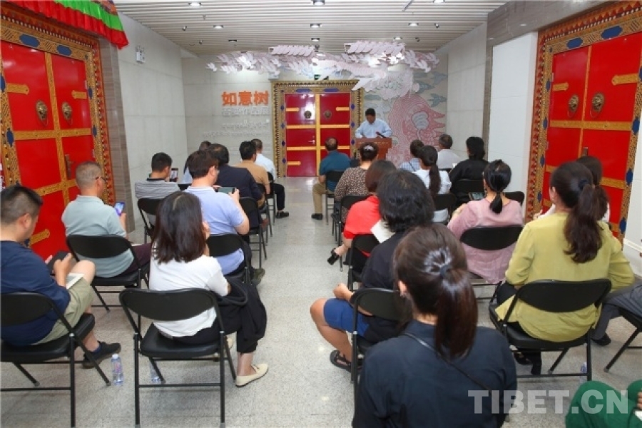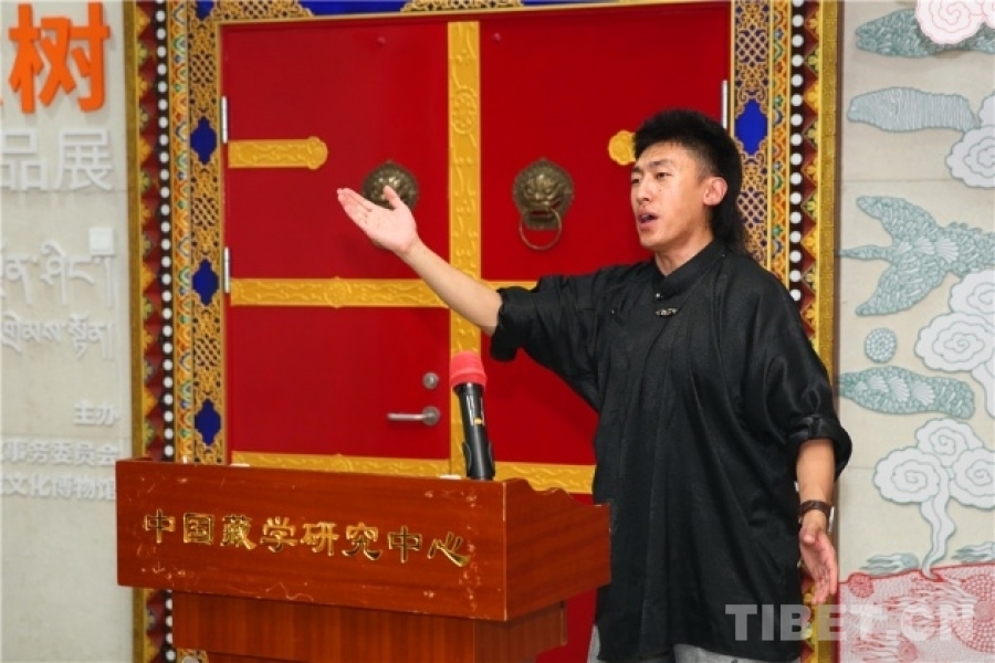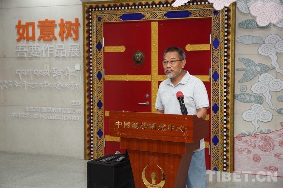 中國西藏網(wǎng)訊 7月5日,由北京市民族宗教事務委員會指導、中國藏學研究中心西藏文化博物館主辦的“如意樹——吾要作品展”在京開幕。中國藏學研究中心有關負責人和專家學者、北京市民族宗教事務委員會有關負責人、書籍設計師吾要及北京藝術界人士等60余人出席開幕式。