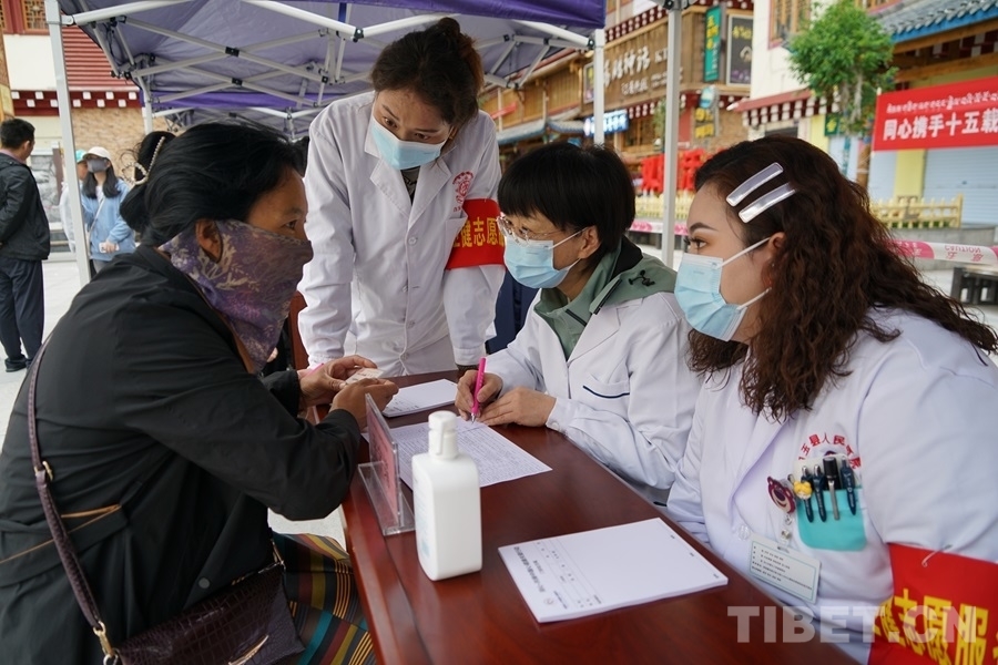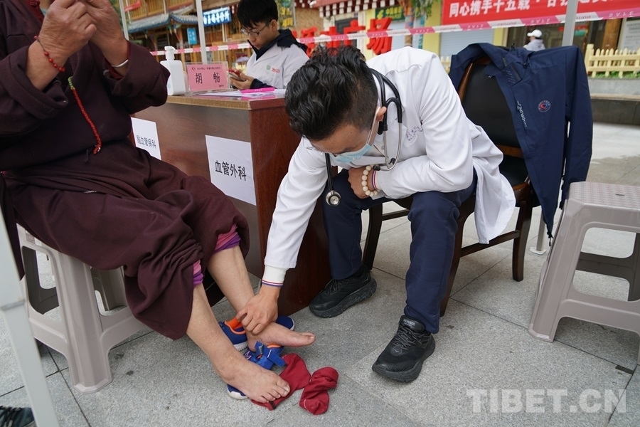 得知有來自北京的醫(yī)療專家為大家義診,家住白玉縣城的切呷一大早便帶著父母來到了義診現(xiàn)場。她的母親澤仁拉嘎今年75歲,自述下肢從腰間、腿部到腳尖都會發(fā)麻、有疼痛感,行走時腰部會很累,偶爾還會因為控制不好腿部活動而摔倒。北京水利醫(yī)院創(chuàng)傷骨科副主任醫(yī)師王耀輝在經(jīng)過詳細問診后,為拉嘎阿媽開具了營養(yǎng)神經(jīng)的藥品,并建議她進一步做胸椎和腰椎方面的檢查。