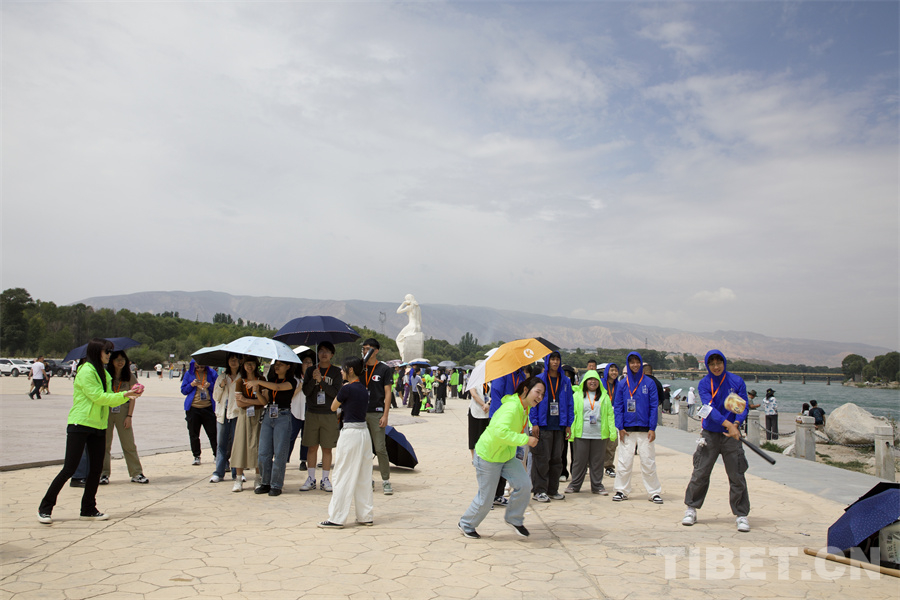 圖為香港交流團(tuán)青少年在貴德黃河少女雕塑前合影留念 攝影:桑吉