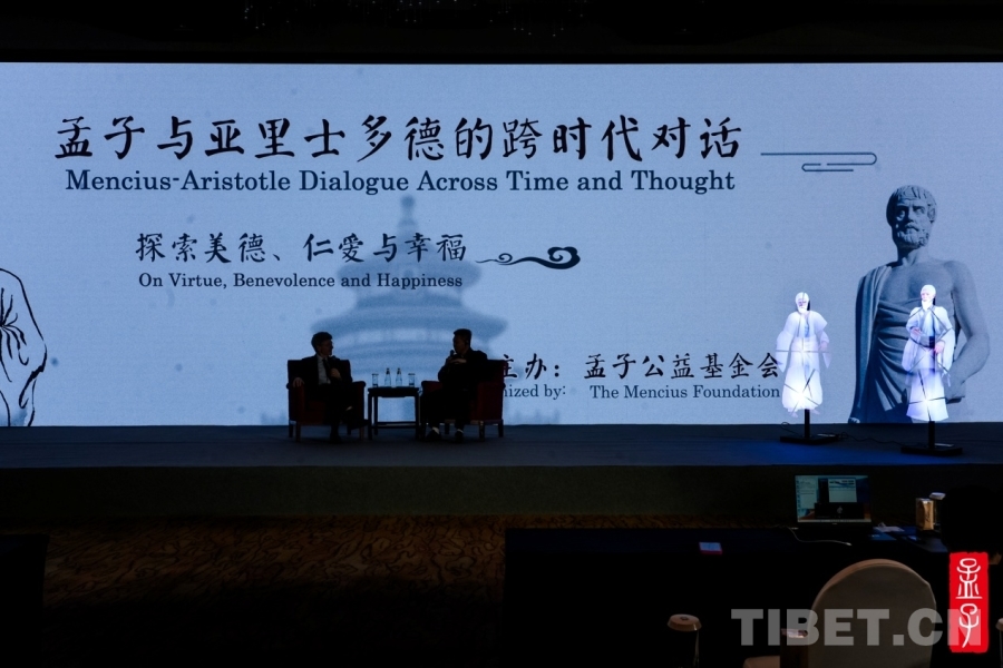 儀式上,以孟子與亞里士多德為人物形象的全息影像對(duì)話逐步展開。孟子公益基金會(huì)理事長孟亮與聯(lián)合國可持續(xù)發(fā)展解決方案網(wǎng)絡(luò)主席杰弗里?薩克斯作為對(duì)話人。此次對(duì)話聚焦孟子和亞里士多德對(duì)美德、仁愛的詮釋,以及兩者之間存在的共通性等。包括孟亮和薩克斯的對(duì)話環(huán)節(jié)、現(xiàn)場嘉賓的提問環(huán)節(jié)。全息影像形式新穎,現(xiàn)場問答氣氛活躍,實(shí)現(xiàn)了一場中西方文明跨越時(shí)間與空間的對(duì)話。(中國西藏網(wǎng) 記者/趙婧茹)