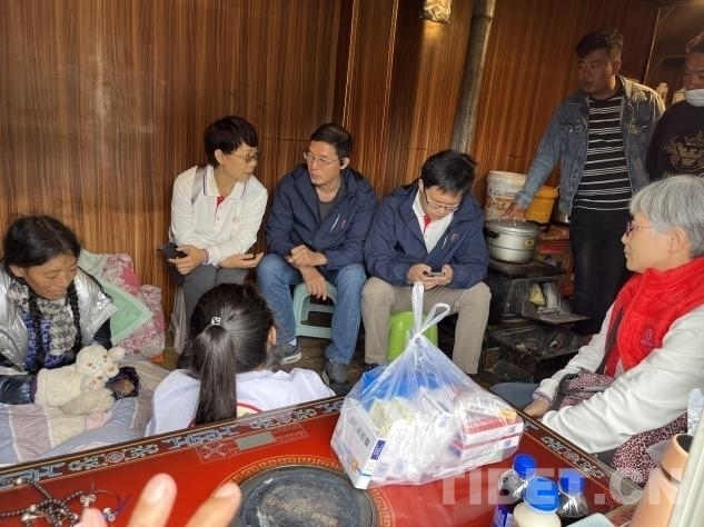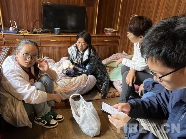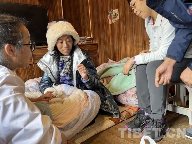 在義診活動進(jìn)行的同時(shí),幾位專家還分撥前往貧困家庭慰問。其中,北京地壇醫(yī)院的中醫(yī)科副主任楊玉英,北京地壇醫(yī)院婦科副主任劉軍,北京老年醫(yī)院呼吸科副主任劉前桂,北京大學(xué)第一醫(yī)院骨科副主任徐貝宇一行來到了離措拉鎮(zhèn)不遠(yuǎn)的德西村山坡上,去阿珍家慰問看診。據(jù)了解,阿珍的母親沖曲措于 2019 年進(jìn)行了胃癌手術(shù),術(shù)后做了五次化療,于 2020 年末完成化療。然而,2024 年 6 月份,沖曲措又被查出患有肺炎。由于吃不下飯,沖曲措體重嚴(yán)重下降,營養(yǎng)嚴(yán)重不良。。