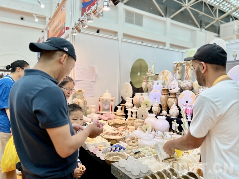 “你好,喜歡哪個給您介紹!”來自巴基斯坦的Sajid正和前來選購的客戶介紹巴基斯坦手工玉產(chǎn)品,展銷點有各式各樣的擺件、茶具、鐘表等,種類繁多,十分精美。他說:“我來拉薩已經(jīng)有三天了,這里氣候舒服,環(huán)境優(yōu)美,我還去過西藏的日喀則,那是個好地方。聽說雪頓節(jié)是西藏非常盛大的傳統(tǒng)節(jié)日,我很高興借此機會帶著巴基斯坦的工藝品來到拉薩,希望拉薩的朋友們喜歡。”
