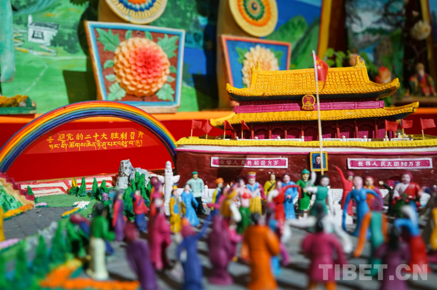 瓊科寺酥油花2018年被列入西藏自治區(qū)第五批自治區(qū)級非物質(zhì)文化遺產(chǎn)代表性項目?!斑@個展廳里最大的一幅作品,是我們寺院內(nèi)20多名僧人花10天時間制作完成的。我們寺院每年都會有符合時代旋律的新時代題材作品創(chuàng)作產(chǎn)生,我希望通過我們一年一年、一點一滴的努力,能夠終有一日將酥油花申報為國家級非物質(zhì)文化遺產(chǎn)代表性項目。”瓊科寺酥油花非遺傳承人阿旺西尼說。