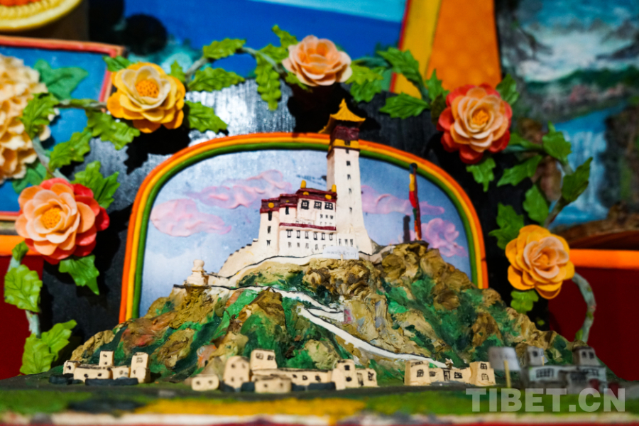 酥油花的產(chǎn)生,一說始于青藏高原的原始宗教苯教,為了減少在祭祀活動中對動物的殺戮,教徒們用糌粑捏成各種祭祀動物形狀,并用酥油在供品上點綴以小小貼花,被稱之為“朵瑪”;一說源于公元641年唐朝同吐蕃聯(lián)姻時,文成公主攜釋迦牟尼12歲等身像入藏,將其供奉于大昭寺,按照儀軌,供奉佛和菩薩的貢品有六色,即花、涂香、圣水、瓦香、果品和佛燈,可當時天寒草枯沒有鮮花,只能用酥油塑花獻佛;一說起于宗喀巴大師的夢境,夢見荊棘變?yōu)槊鳠?,雜草化為鮮花,無數(shù)奇珍異寶,五光十色,燦爛奪目,醒后即刻組織藝僧用酥油制作重現(xiàn)夢中勝境。無論哪種說法,酥油花從宗教貢品到傳統(tǒng)技藝的演變,都是藏族人民向善向上的具象化呈現(xiàn)。