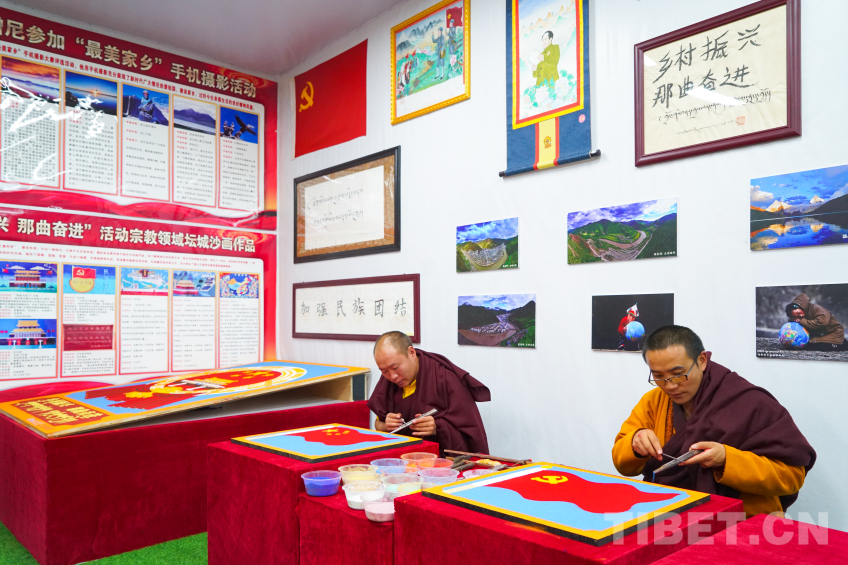 中國西藏網(wǎng)訊 2024年那曲恰青賽馬節(jié)暨第三屆“鄉(xiāng)村振興 那曲奮進”活動現(xiàn)場,兩位來自那曲市索縣加勤鄉(xiāng)尼瑪林寺的僧人用彩砂繪制工藝繪制黨徽、國旗、國徽等彩砂作品,深切表達藏傳佛教僧人愛黨愛國愛教之情,用實際行動踐行聽黨話、感黨恩、跟黨走,加深信教群眾對于祖國的熱愛。