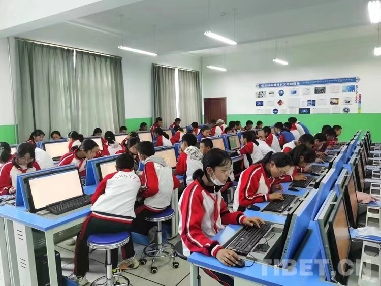 圖為西藏日喀則市上海實(shí)驗(yàn)中學(xué)學(xué)生們?cè)谏闲畔⒓夹g(shù)課 攝影:王淑