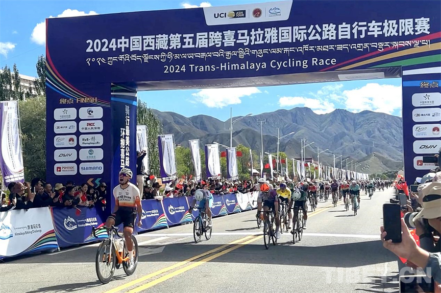 圖為日喀則賽段自行車選手沖線現(xiàn)場 攝影:邊子捷