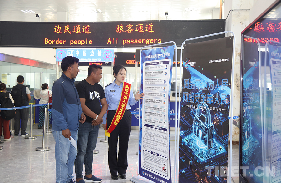 圖為聶拉木出入境邊防檢查站移民管理警察為入境中國游客宣講網(wǎng)絡(luò)安全知識 攝影:高榮元