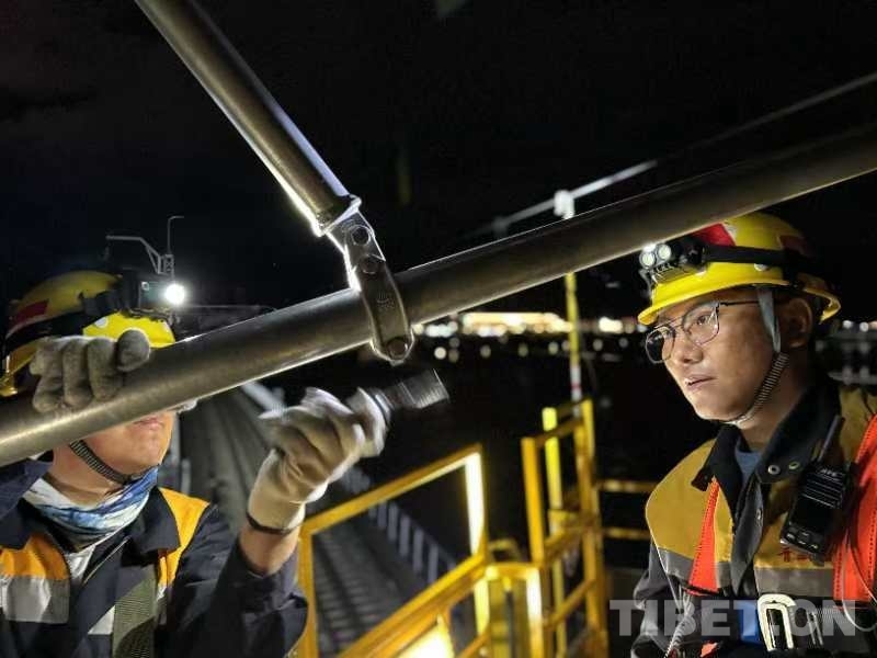 23時00分,軌道車穩(wěn)穩(wěn)???,“天窗”作業(yè)命令下達。中國鐵路青藏集團有限公司拉薩基礎(chǔ)設(shè)施段供電維修技術(shù)中心拉薩南接觸網(wǎng)維修隊工長李積王帶著7名工友走下接觸網(wǎng)作業(yè)車,驗電、連接地線端、接掛地線……一系列操作一氣呵成。隨即,現(xiàn)場負責(zé)人拉加和工友們依次登上距離地面6米高的作業(yè)平臺上,穿梭于接觸網(wǎng)線索之間,猶如凌空“舞者”。