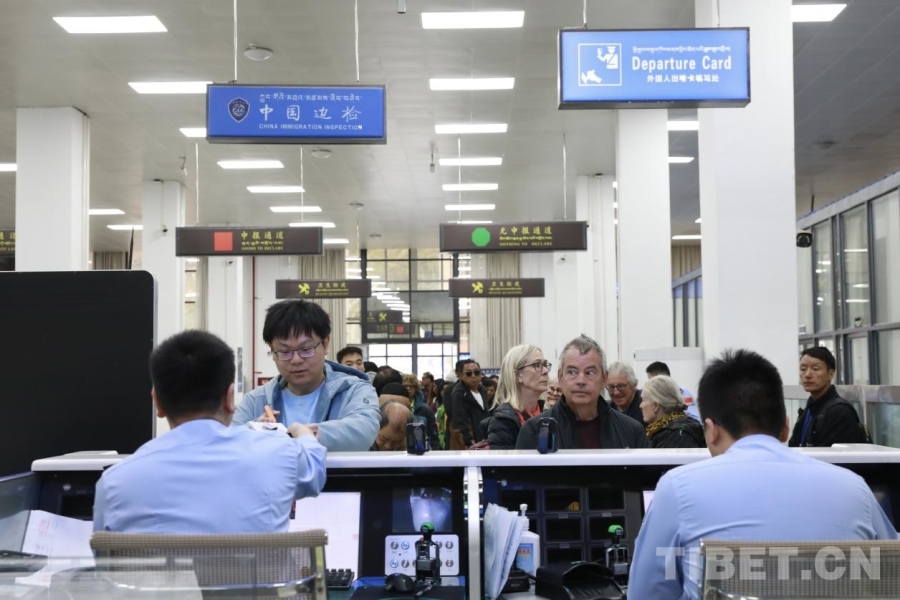 另一邊,在吉隆口岸出境大廳內(nèi),吉隆出入境邊防檢查站執(zhí)勤二隊(duì)副隊(duì)長(zhǎng)曹剛正帶領(lǐng)著隊(duì)員為過(guò)境旅客辦理手續(xù)。關(guān)卡設(shè)置快捷便利,信息化的通關(guān)服務(wù)極大地提高了通關(guān)效率。來(lái)自福建的陳女士便是其中一位受惠者,“很多(尼泊爾的)邊民是因?yàn)橘?gòu)物出入境的,他們看我們是中國(guó)游客,就讓我們先過(guò)檢,通關(guān)挺順利的,也很快?!?nbsp;